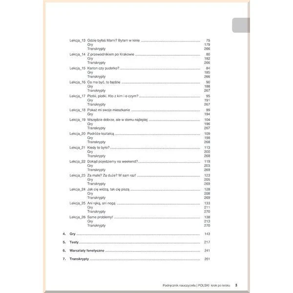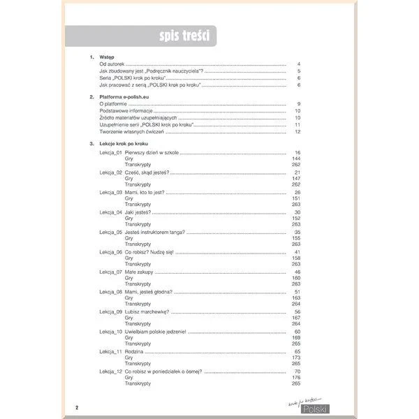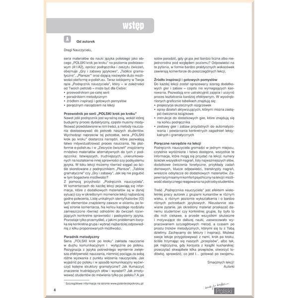Підручник вчителя був розроблений для тих, хто хоче викладати не лише ефективно, але також творчо та цікаво для учня. Даний матеріал є незамінним методичним посібником та зручним інструментом на уроках завдяки великій кількості корисної інформації, сформульованої чітко та зрозуміло. Детальне керівництво містить відповіді на питання, що найбільш часто ставляться вчителями: «як правильно подавати учням новий граматичний матеріал?», «як пояснити значення нових слів без перекладу на мову учня?», «як працювати у великих і різних за рівнем групах?», «як мотивувати студентів говорити тільки польською?», «як не бути нудним викладачем?» і багато іншого.