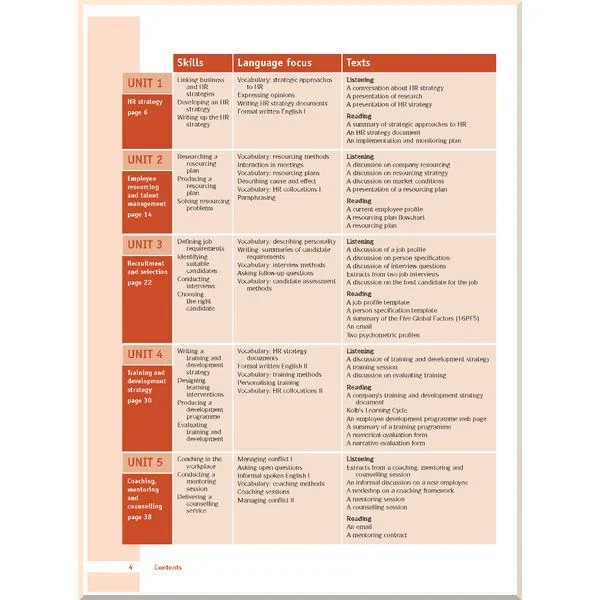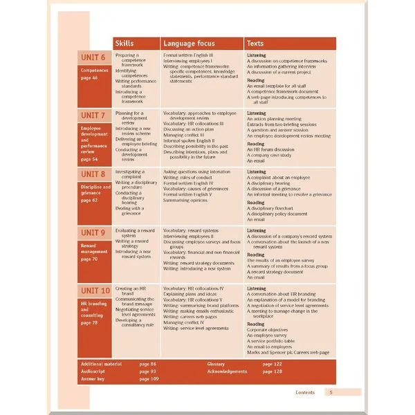 10 незалежних уроків зосереджені на ключових питаннях менеджменту та розвитку персоналу. Вивчення спеціальної лексики та теорії управління персоналу дозволяє оволодіти такими необхідними навичками, як коучінг, розробка та впровадження систем оцінювання, вирішення конфліктів та інших.