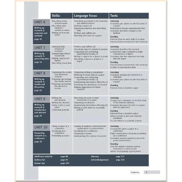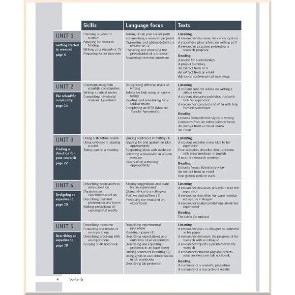 Cambridge English for Scientists також сприяє розвитку мовних навичок з практичними навичками читання і письма – наприклад, запит на фінансування дослідження або написання публікацій – а також навички говоріння та аудіювання, наприклад, «Опис проблем пов’язаних з дослідженням», «Виступ на конференції».