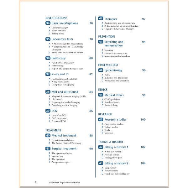 Professional English in Use Medicine містить 60 уроків, які охоплюють широкий спектр медичної лексики. Теми підручника: хвороби, симптоми, обстеження, лікування і профілактика. Книга також знайомить із загальною медичною лексикою, яка пов’язана з частинами та функціями тіла, медичним персоналом, освітою та навчанням, науковими дослідженнями і презентаціями. Professional English in Use Medicine був ретельно досліджений медичним корпусом Інституту прикладної лінгвістики і є обов’язковим для викладачів медичної англійської і для практикуючих лікарів, яким необхідно застосовувати англійську на роботі або в свої країні, або поза її межами.