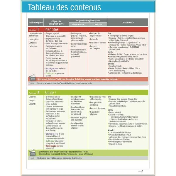 Кожен розділ складається зі вступу (один розворот), нового матеріалу (шість розворотів), і завершується розворотом, присвяченим підсумковому контролю, завдяки якому учні зможуть підготуватися до іспиту DELF B2.