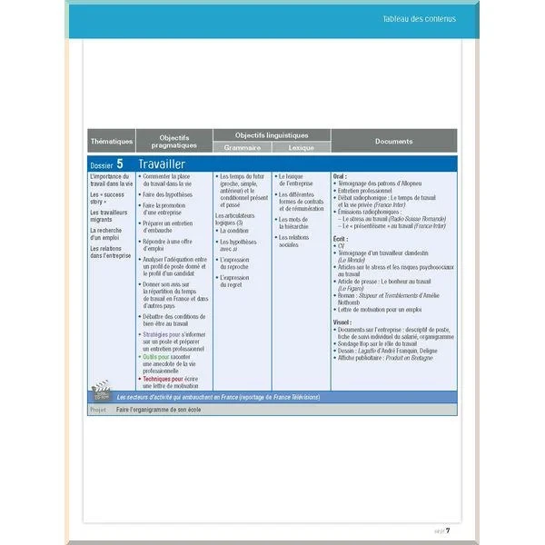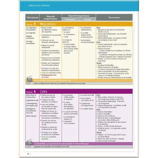Кожен урок включає в себе вправи на розуміння нової теми завдяки аудіодокументу й / або написаному тексту, роботу з висловами та зворотами, характерними в конкретній ситуації, роботу з лексикою та граматикою, структурування нового матеріалу, інформацію про Францію та / або франкомовні країни.