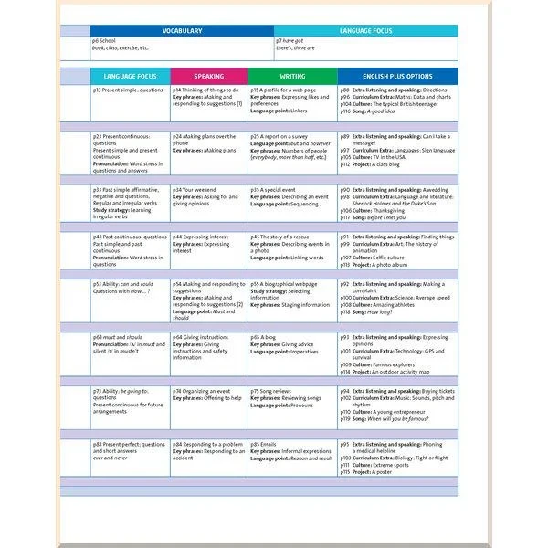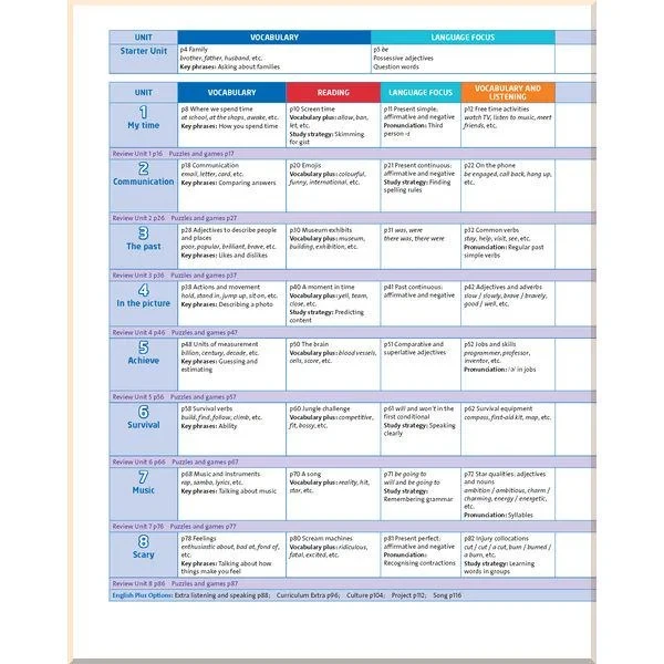 На сторінках підручника учні знайдуть бокси під назвою «Ключові фрази» та «Навчальна стратегія», які допоможуть розвинути навички самостійного навчання. Вправи для просунутих учнів та «Спеціальні уроки» наприкінці підручника допоможуть розширити основний матеріал курсу, який підійде для учнів із різним рівнем знань.