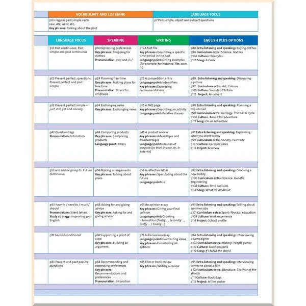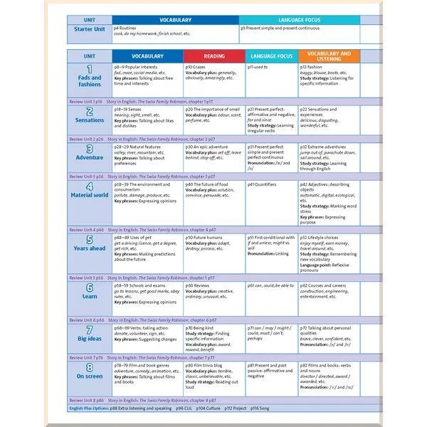 На сторінках підручника учні знайдуть бокси під назвою «Ключові фрази» та «Навчальна стратегія», які допоможуть розвинути навички самостійного навчання. Вправи для просунутих учнів та «Спеціальні уроки» наприкінці підручника допоможуть розширити основний матеріал курсу, який підійде для учнів із різним рівнем знань.
