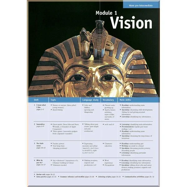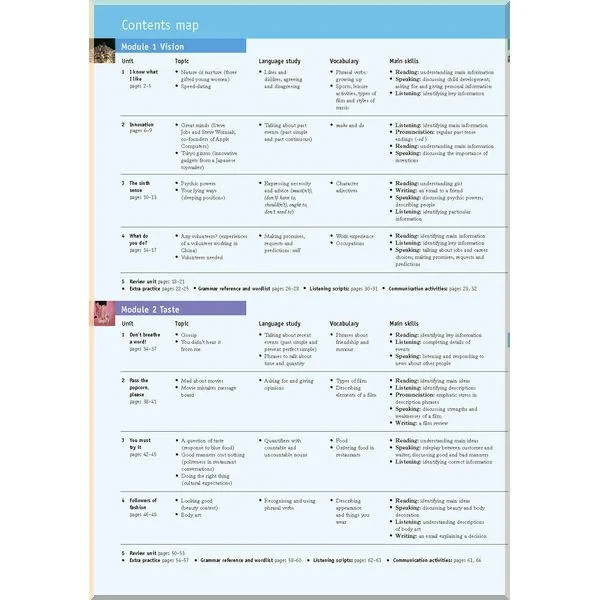 У кожному модулі представлена низка суміжних тем, об’єднаних одним предметом обговорення. Наприклад, модуль «Стиль життя» розбитий на теми про щоденну рутину, звички, тиск слави, про дім і незалежність. Матеріал модуля розрахований на 15 годин роботи в класі.