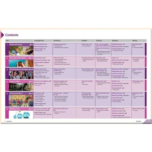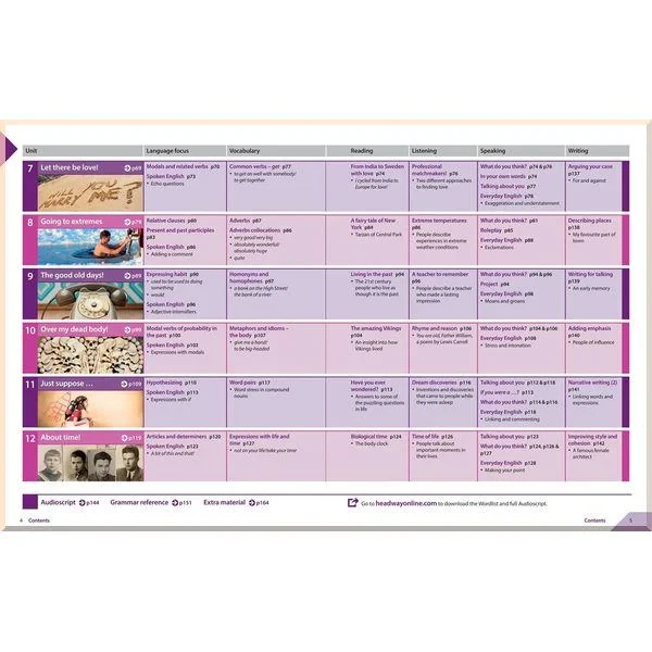 У кожному підручнику курсу представлено 14 навчальних тем, які представлені в загальновідомій структурі курсу Headway і методології інтегрування базових навичок.