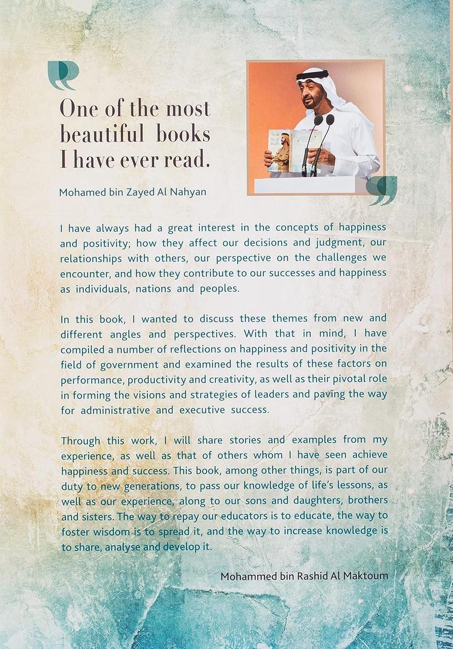 У цій престижній книзі Його Високості шейха Мохаммеда бін Рашида Аль Мактума, віце-президента і прем'єр-міністра ОАЕ та правителя Дубаю, розглядаються два поняття, в яких шейх Мохаммед має великий особистий інтерес: щастя і позитивність. Він досліджує взаємозв'язок між ними та аналізує, як вони впливають на досягнення, продуктивність і творчість. Написана арабською мовою власноруч шейхом Мохаммедом, ця глибока книга містить як особисті історії, так і міжнародну перспективу, щоб підкреслити ключову роль, яку щастя і позитивність відіграють у формуванні лідерських стратегій і зміцненні стосунків між членами колективу.
