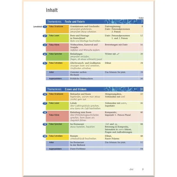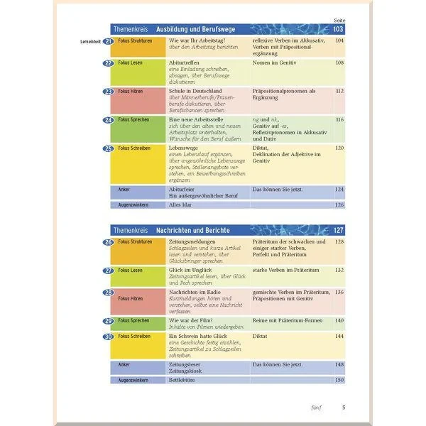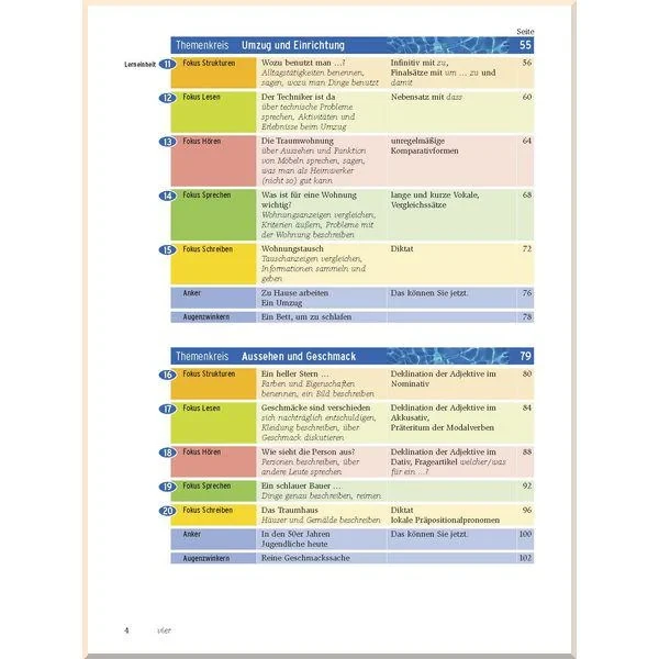 Підручник складається з тематичних блоків. Він містить практичний тест на визначення рівня володіння мовою (початкова німецька 1 і 2 або сертифікат німецької мови), систематичний огляд граматичного матеріалу, а також лексичний мінімум.